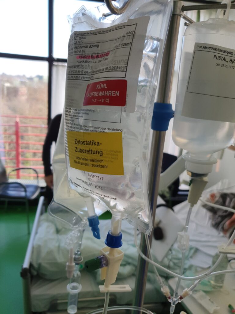 Long time no see. Zum einen gab es nicht so viel Neues und zum anderen haben sie es geschafft mit der letzten Chemo doch noch meine Blutwerte zu ruinieren. Also Zuhause endlich angekommen war erstamal nicht viel mit großer Freude sondern eher Abgeschlagenheit, pulsierende Geräusche auf den Ohren und Kopfschmerzen. Das ganze trotz Versorgung mit Erothrozyten und Thromzyten am letzten Tag. Das ging so drei Tage und dann hatte ich am Donnerstag den ersten Termin in der Ambulanz und fühlte mich eigentlich ganz OK. Schnell eröffnete man mir, dass ich im Zustand der Anämie sei und Maske tragen müsse. Das war neu. Also erhielt ich noch eine Blutkonserve ambulant, da der Kram durch die lange PICC-Line nur sehr langsam lief, habe ich nach 2h den hydrostatischen Druck durch Positionierung auf dem Tisch deutlich erhöhen und der Kram lief danach zwei bis dreimal so schnell. Weiter teilte die junge Ärztin mir mit, dass ich die vierfache Dosis Cyclophosphamid wie be der letzten Chemo erhalten hatte. Daher solle ich die Booster-Spritzen noch bis zum nächsten Termin kommenden Montag nehmen und mir welche in der Apotheke besorgen. Gesagt, getan und beim Blick auf den Kassenstand beeindruckt. Es waren so um die 2.800 € und bei dem Anblick musste ich an mein erstes Auto denken: einen Passat 1 mit 1.2l Hubraum hellblau mit orangen Sitzen. Den hatte ich für 1300 DM gekauft. Durch halbieren der Bestellmenge, Bargeld und Ausnutzen den Kartenlimits konnte ich den Betrag von 1.500 € schließlich begleichen. Frohen Mutes fuhr ich Nachhause und setzte mir die Spritzen, die man zunächst aufziehen muss. Auf dem Sofa liegen also beeindruckende 300 €, die ich mir jeden Abend gönne. Christian Lindner sagte zu den Bauern, sie sollten doch an das große Ziel denken und sich nicht im Klein Klein verlieren. Das hab ich mir zu Herzen genommen, falls ich mal wieder Wein trinken sollte, lasse ich mir den auch was kosten, Prost!