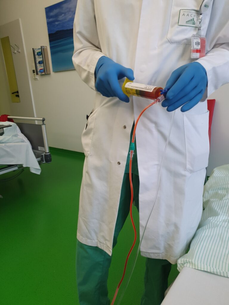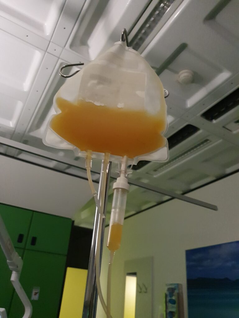 Bei dem Bild braucht es keine Worte: Am frühen Nachmittag verübte ein heimtückisch dahergekommener Chemoaktivist in grünen Hosen einen Anschlag auf mich, um mir seine rote Soße (Daunorubicin) einzuspritzen. Brandenburger Tor Feeling kommt auf bei Betrachtung der Quadriga an Zytostatika, die mir eingeflöst wird, s. Zubereitungen mhhh. Muss ja nicht immer Bier sein 🙂