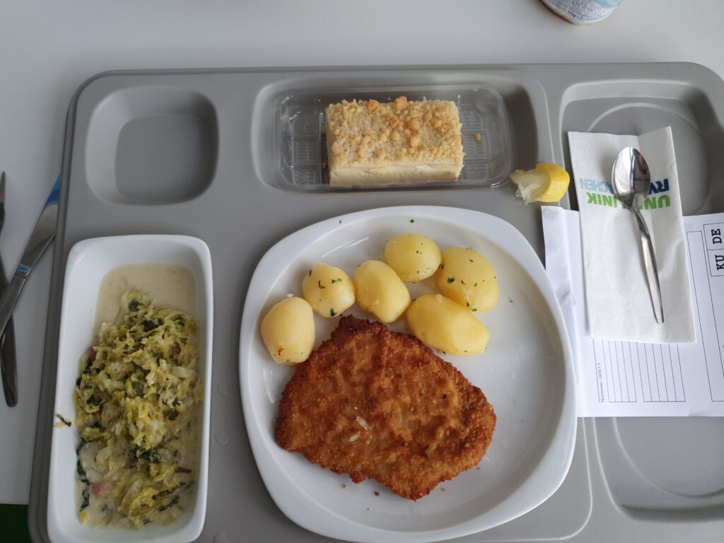Essenstechnisch ganz weit vorne. Wurst in Großhandelsqualität, lecker Brötchen und Brot und mittags deftiges wie Currywurst und so Öscher Wurstkram mit Kartoffelbrei und Sauerkraut. Im Bild knuspriges (ohne blöd) wiener Feeling mit Wirsing und original gedecktem Apfelkuchen.
