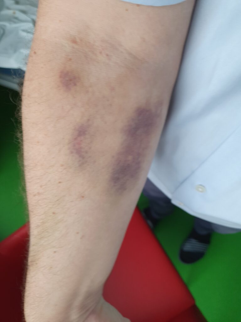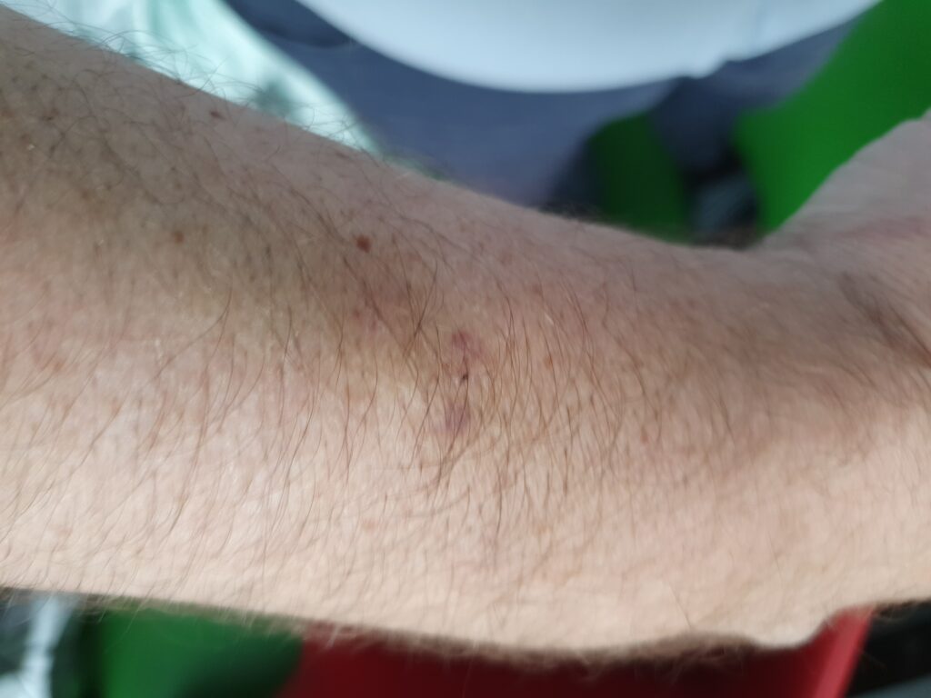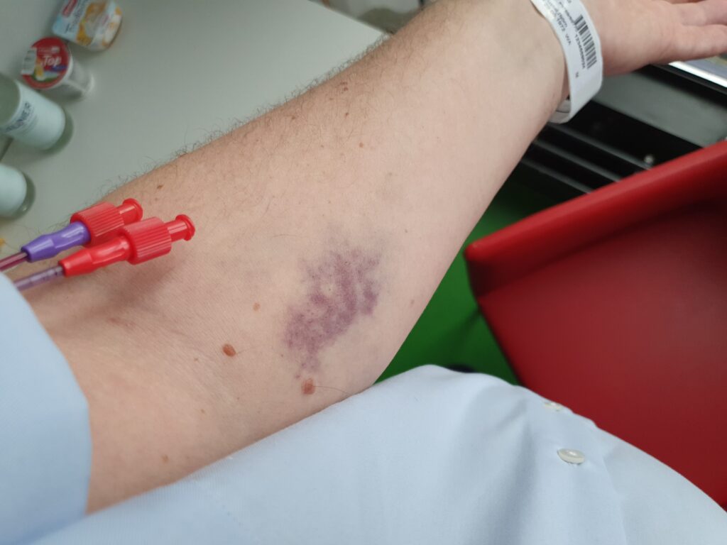 Die Bilder sehen nur so aus als hätte ich in einem 12-Zylinder LKW Kurbelgehäuse die Kolben ausgebaut. Es ist nicht immer einfach den richtigen vorläufigen Zugang zum Patienten für die Chemo zu finden. Der zuständige Assistenzarzt hatte die ersten drei Versuche verhauen, bis er seine hyperaktive Kollegin in Vorfreude auf den Glühweintreff am Katschhof rief, die noch drei weitere Versuche erfolglos unternahm. Danach gabs doch einen in die Armbeuge. Am nächsten Tag erhielt ich dann zwei Break-Out Kabel genannt PICC-Line (Peripherally Inserted Central Catheter). Seidem werde ich für Infusionen und Blutabnahme nicht mehr von den Studenten zerstochen.