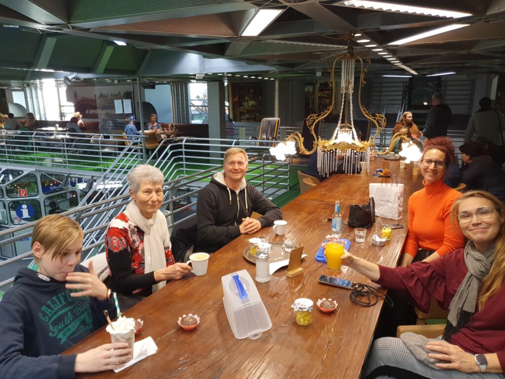 Und am Tag danach kommt zur Freude noch die Sonne raus und mehr Familie. Die gute Schwester mir Schwager und Mutti sind zu Besuch. Nach einem schönen Spaziergang lassen wir es uns bei mitgebrachten Muffins von Mutti in der Cafeteria gut gehen. Diesesmal sind der große Bub und wieder die liebe Biene dabei 🙂