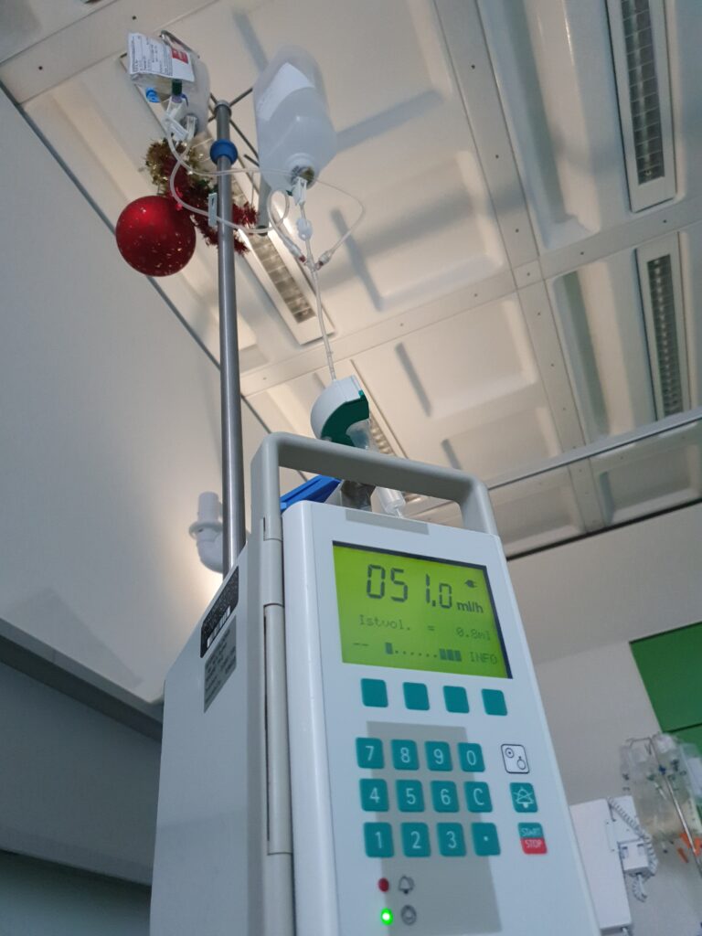 Nach dieser niederträchtigen Tat, wurde der Aktivist anscheinend gefasst. Am 19.12.2023 geht es ohne Gnade weiter. Die Automatisierung hat Einzug erhalten. Erst fließt die gute PEG-Asparaginase 2h durch den Automaten und dann gibts ne Extraspritze Vincristin oben drauf. Der Christbaum füllt sich.
