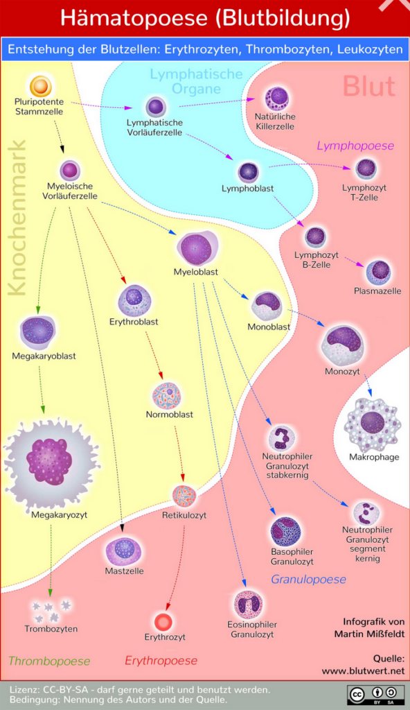 Damit Ihr den Kauderwelsch versteht hier nochmal gesundes Schulwissen zur Blutbildung. Von der Stammzelle im Knochenmark entsteht in den lymphatischen Organen zunächst die Vorläuferzelle und dann ein Lymphoblast. Die Oberärztin meinte gerade, dass die Bildung der B-Lymphozyten mehr im Knochenmark stattfindet und die Milz mehr für den Abbau zuständig ist. In den Lymphknoten werden sie dann spezifisch geprägt. Wie auch immer aus dem Lymphoblast entwickelt sich dann auch die B-Zelle. Durch genetische Tests hatte man festgestellt, dass diese bei der Zellteilung dirket am Anfag entartet und aufgrund der Dynamik andere Zellen im Blutvolumen verdrängt. Es waren also viel zu viele unfertige Lymphoblasten in meinem Blut, die als Fremdkörper abgebaut werden und daher der LDH Wert (Lactatdehydrogenase) exorbitant hoch war.