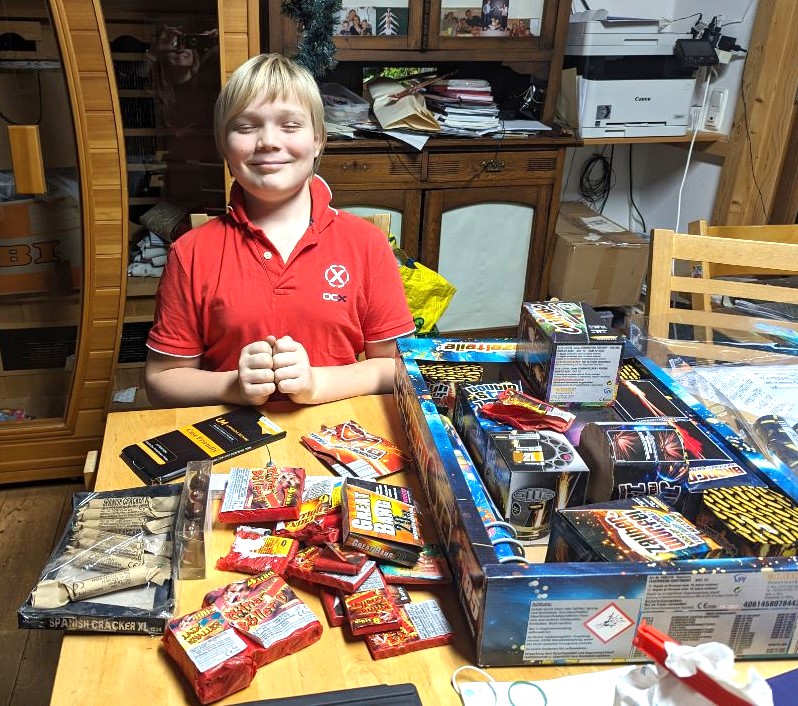 Unser kleiner Raketenmann hat dieses Jahr vorgesorgt und sortiert seine Schätze, um in wohlüberlegter Reihenfolge das Heimfeuerwerk zum Erfolg zu führen. Das aktualisierte Blutbarometer unter „Gefühle“ sieht auch sehr gut aus: Wenn heute keinen katastrophalen Blutwerte reinkommen, dann darf ich wieder nach Hause und mitballern. Glückliche Kinder, glückliche Frau, glücklicher Mann 🙂