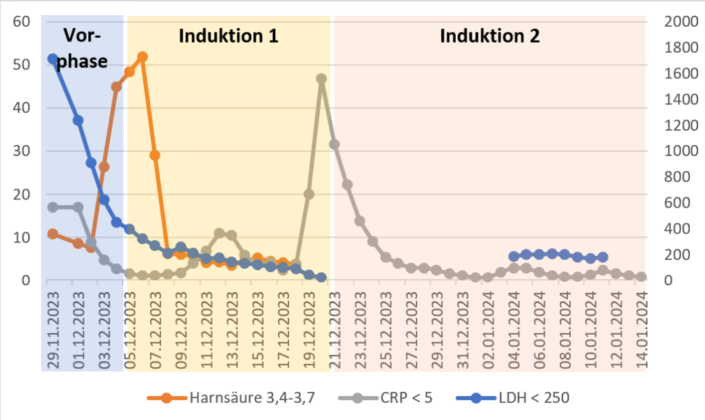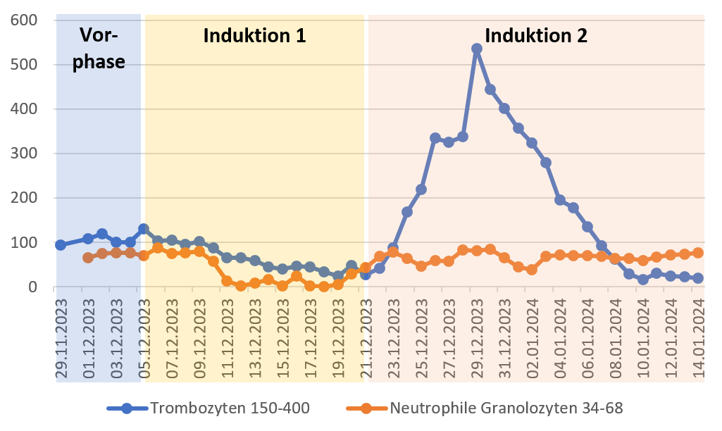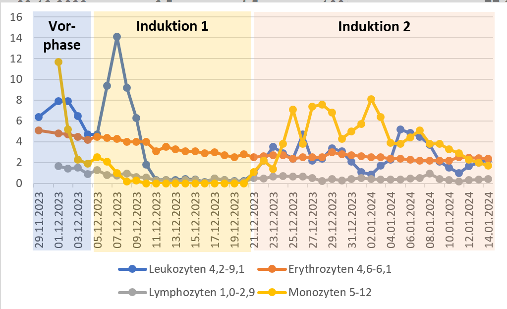 Der Prof. hier meinte ich solle über meine Gefühle reden. Andere sagen so was auch, daher echte Inschnörs-BBone Feelings in Graphen. Der LDH-Wert rechts aufgetraggen wurde auch schon beim Hausarzt ermittelt und stieg in den 3 Wochen vor der Einweisung von 700 auf 1600 an. In der Vorphase startete er mit 1700. Soweit ich mich entsinne, war das Ziel der Vorphase, die Blasten aus dem Blut zu bringen, was anhand des LDH’s mit 400 ganz gut gelungen ist. Entzündungswerte CRP gingen auch zurück und man muss genug trinken, dass die Harnsäure nicht die Nieren killed. Trinken hört sich vertraut an für Tiefblech, ist aber nicht immer ganz einfach, wenn einem speiübel ist, das hat man gewöhnlich ja danach. Die Induktionsphase 2 wurde eingeläutet und man kann anhand der CRP-Werte erkennen, dass Anzeichen einer leichten Erkrankung vorliegen. Vielleicht der Durfall am 18.12.2023 doch viral oder durch Chemo-Kampf bedingt. Jedenfalls fühle ich mich gut und symptomlos. Stand 21.12 sind die Infektionswerte wieder rückläufig. Erstaunlich aber trotz Chemo sieht alles recht gut aus, der Bub macht seine Spaziergänge, ist rechtzeitig vor der Chemo: Alles Top zum Jahreswechsel. Stand 07.01 alles gut außer dass die Trombozyten unter der Chemo leiden und Hämoglobin ist auch unterdurchschittlich. 12.01 Wie erwartet gehen die Blutwerte unter der Chemo nun allg. zurück, daher erhielt ich 3 X Erythrozyten und 1 X Thrombozyten. Für die Granulozyten erhalte ich Booster-Spritzen. 14.01 Zum Abschluss der Induktion 2 die aktualisierten Blutwerte. Alles gut für die Entlassung morgen 🙂