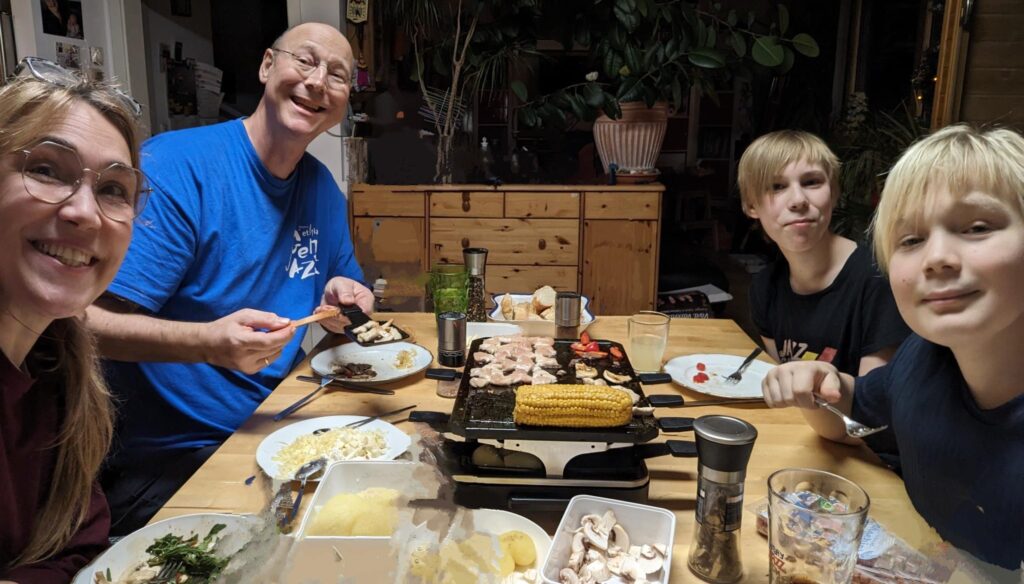 Gestern gabs keine Chemo und ich durfte nachmittags den Heimweg antreten. Nachdem ich mich auf dem Sofa etwas gelümmelt hatte, überlegeten wir, was wir essen könnten. Meine gute Frau hatte die wesentlichen Zutaten für Raclette eingekauft und ich fand Gefallen an dieser Idee, denn es ist immer ein herrliches ausschweifendes Zusammenessen. Daher habe ich alles gechnippelt und gegen 18:00 Uhr ging es dann los. Bei mir verläuft es irgendwie immer ähnlich, die ersten 10 Schäufelchen Hunger und Ungeduld und dann plötzlich satt. Es schmeckte aber dennoch hervorragend wie man sieht und wir hatten einen geselligen Abend. Gegen 20:00 Uhr haben wir dann Ottos Feuerwerk verballert. Wir wünschen allen ein gesegnetes neues Jahr und einen raketenmäßigen Start.