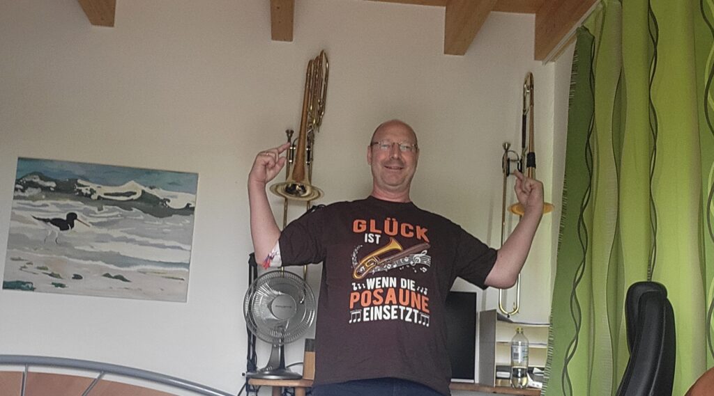 Trombirds ist eine der legendären Soloplatten von Albert neben Trombirds mit Yellow Hammer und Blues of the Cellar Lark. An dieser Stelle ggf. „Neues von der Krebsfront“ lesen. Ganz so bunt fühle ich mich nicht mit dem Chemo-Schalk im Nacken. Je nach Toxizität regen sich Gefühle wie nach dem gelben Hammerschlag oder einer Kellerlärche oder einer Kellerlärche mit gelbem Hammerschlagmuster. Klar ist, kein anderer Song drückt meine Gefühle so lebhaft aus wie Trombirds. Etwa so bunt wie die von Sabine gemalte Möwe neben mir (je nach Browserformat abgeschnitten). Hohe Wellen sorgen für Übelkeit auf der Chemosee den Blick in die ungewisse Weite des Horizonts gerichtet. Erst wenn meine zwei Trombonen in den Fokus rücken wird mein Lebensgefühl klar: „Glück ist, wenn die Posaune einsetzt“. Ich dachte mir wenn schon Chemo, muss ich gut aussehen oder zumindest gut aussehende neue Shirts tragen. Salut!